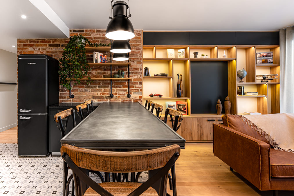 Des meubles vintage et des luminaires contemporains complètent le look industriel, avec des étagères ouvertes et des meubles modulaires maximisant l’espace.