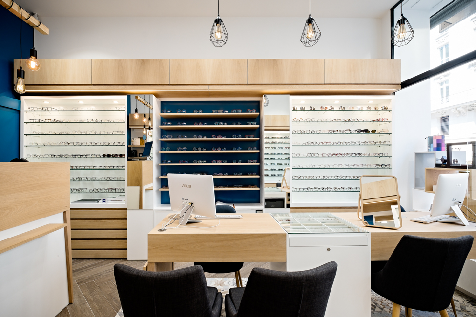 Une très belle boutique d’optique en plein coeur de Paris, avec une rénovation complète de l’espace de vente. Le mélange du beu et du bois donne un rendu chaleureux à cet espace .
